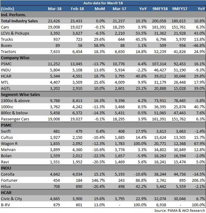 The sales of car in March was bit slow and amounted to 18,988 units compared to 18,295 of March 2017, Pakistan Automotive Manufacturers Association says on website.