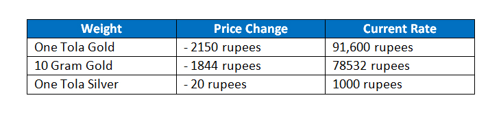 Karachi (Dunya News) – Gold in market is being traded at PKR 91,600 per tola after reduction of Rs 2,150.
