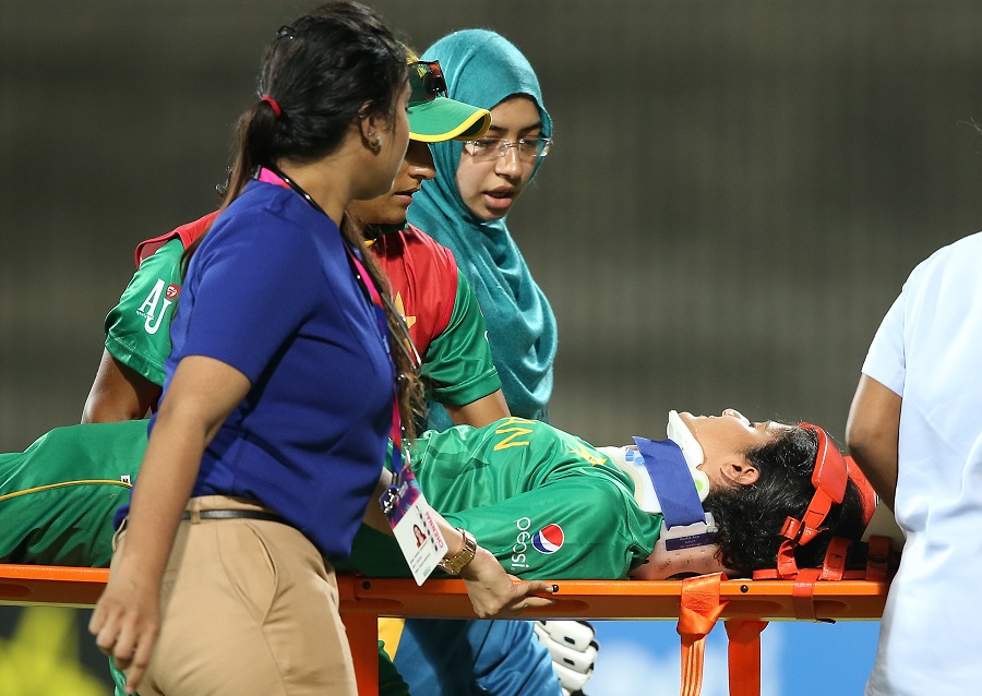 Chasing a low total of 104 to win, Pakistna suffered an early blow when opener Javeria Khan was hit by a bouncer from Shamilia Connell on the in the first over, and was stretchered off.