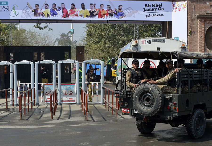 Thousands of police and troops patrolled the area around the Gaddafi Stadium and military helicopters whirred overhead in heavy security more commonly associated with visiting heads-of-state.