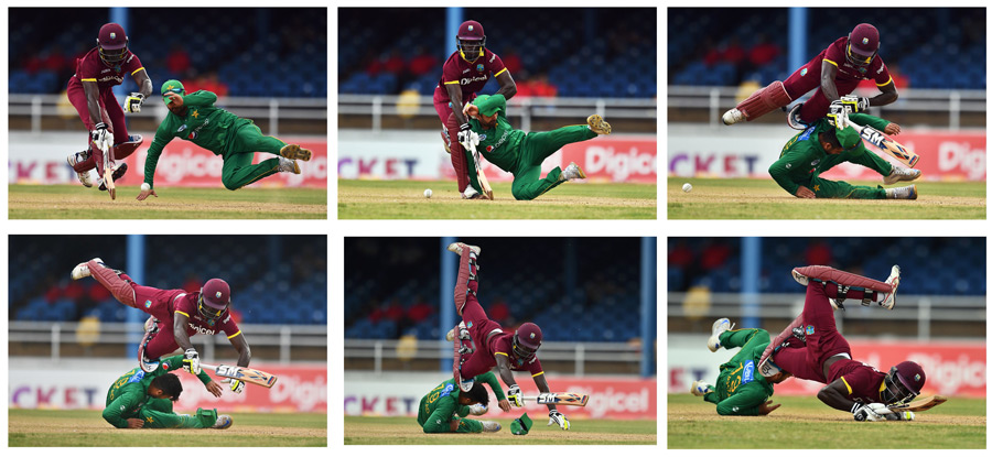 The Queen s Park Oval witnessed three collisions in a bizarre sequence of events in the second innings. Nine balls after the collision between Shadab and Lewis, Chadwick Walton rammed into Tanvir. In the same over, Shehzad collided with Walton and had to be stretchered off the field in an ambulance.
