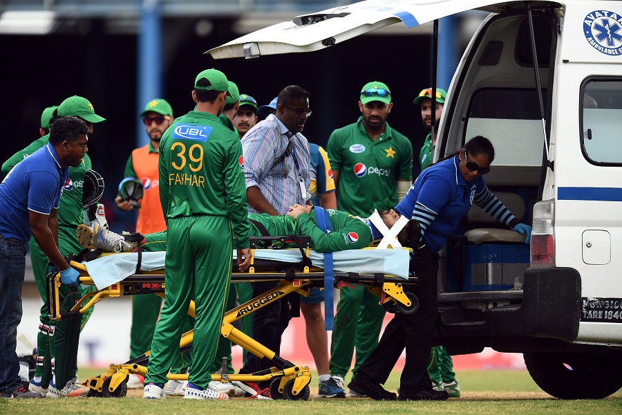 Samuels had dabbed the ball in front of point, from where Shehzad ran in to attack the ball, but lost his balance. His neck crashed into the knees of Walton. Seven overs later, however, Shehzad returned to the field.