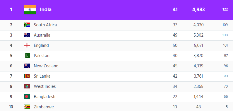India are sitting at the top of the table with 122 points, followed by South Africa (109) and Australia (108). England hold the fourth spot with 101 points.
