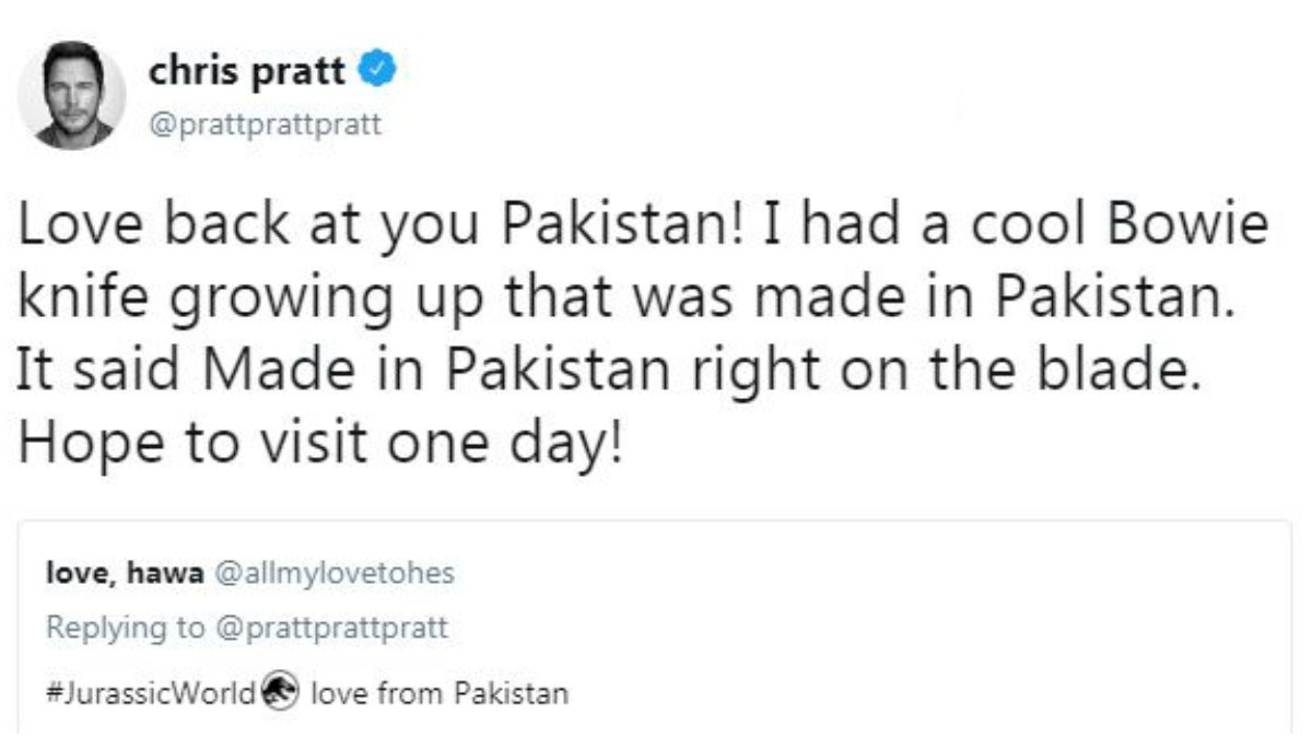 (Web Desk) – Chris Pratt aka Star-Lord—while replying to a Pakistani fan on popular microblogging website Twitter—stated that he wanted to visit Pakistan one day.
