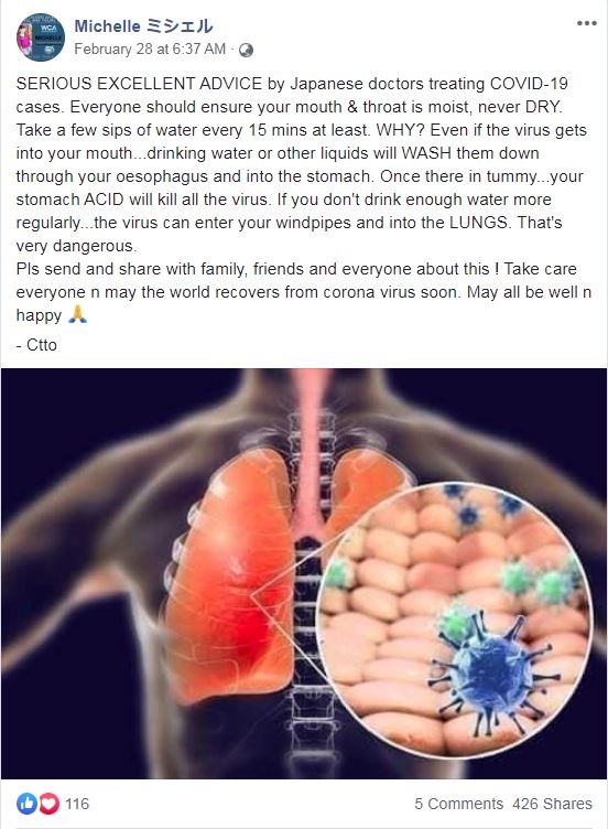 The post reads, in part: “SERIOUS EXCELLENT ADVICE by Japanese doctors treating COVID-19 cases. Everyone should ensure your mouth & throat is moist, never DRY. Take a few sips of water every 15 mins at least. WHY? Even if the virus gets into your mouth...drinking water or other liquids will WASH them down through your oesophagus and into the stomach. Once there in tummy...your stomach ACID will kill all the virus. If you don t drink enough water more regularly...the virus can enter your windpipes and into the LUNGS. That s very dangerous.”