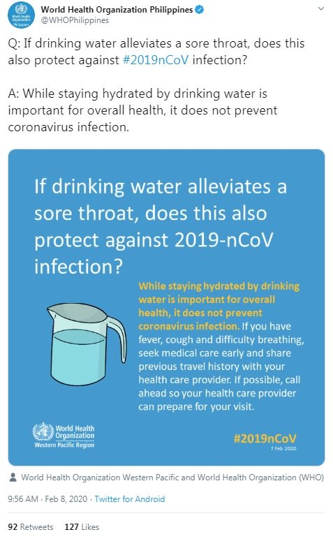 This tweet on the WHO s official Twitter account states in part: “While staying hydrated by drinking water is important for overall health, it does not prevent coronavirus infection.”