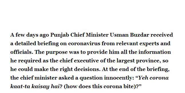 Earlier, the local newspaper in its report claimed that a few days ago Punjab Chief Minister Usman Buzdar received a detailed briefing on coronavirus from relevant experts and officials. The purpose was to provide him all the information he required as the chief executive of the largest province, so he could make the right decisions. At the end of the briefing, the chief minister asked a question innocently: “Yeh corona kaat-ta kaisay hai? (how does this corona bite)?”