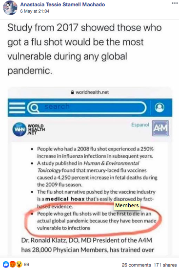 The text overlay in the image reads: “Study from 2017 showed those who got a flu shot would be the most vulnerable during any global pandemic.”