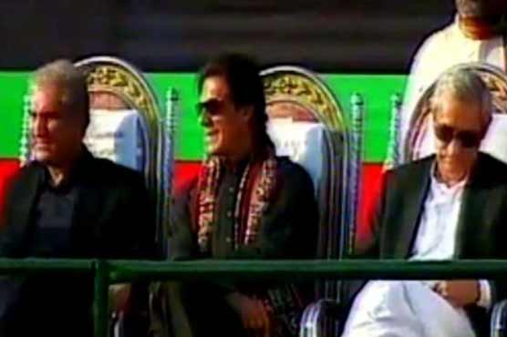 Imran Khan on stage with PTI leaders Shah Mehmood Qureshi (L) and Jahangir Tareen (R)