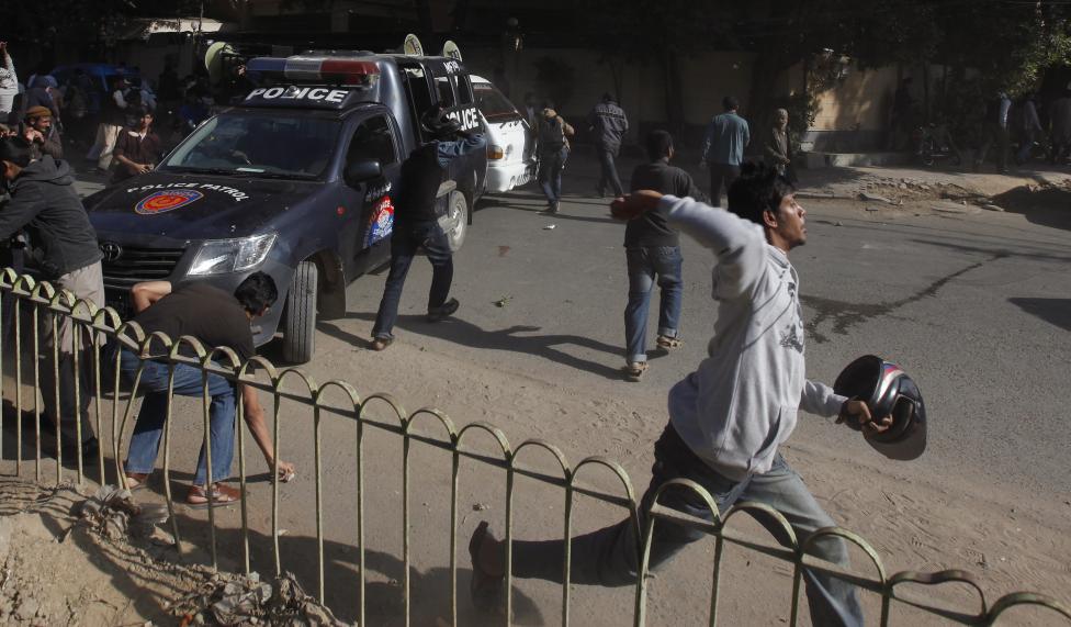 A supporter of Jamiat Talaba Islam (JTI), the student wing of Jamat Islami (JI), throws stones with others at policemen - Reuters