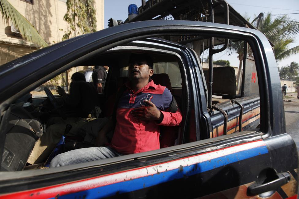 Asif Hassan, a photographer of media organiztion, sits in a police vehicle with his hand on his chest, after being shot during a protest against satirical French weekly Charlie Hebdo, in Karachi - Reuters