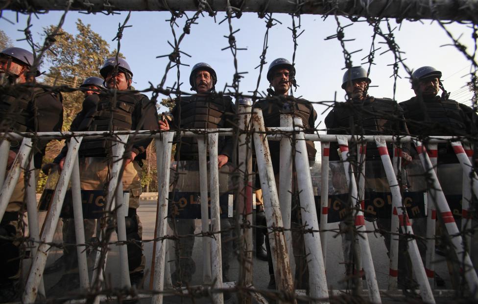 Policemen try to stop protesters during a protest against satirical French weekly Charlie Hebdo, in Karachi - Reuters