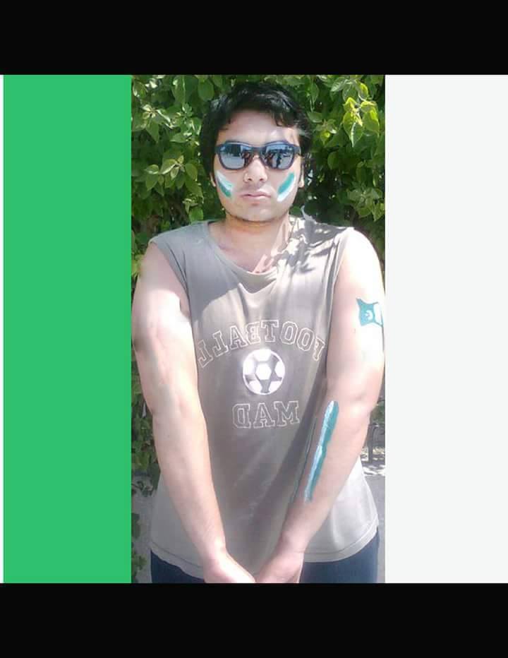 Fan posing with Pakistani team kit.