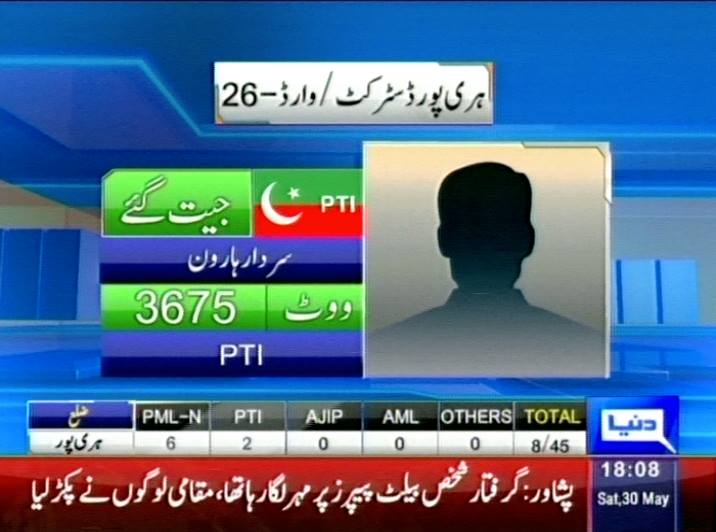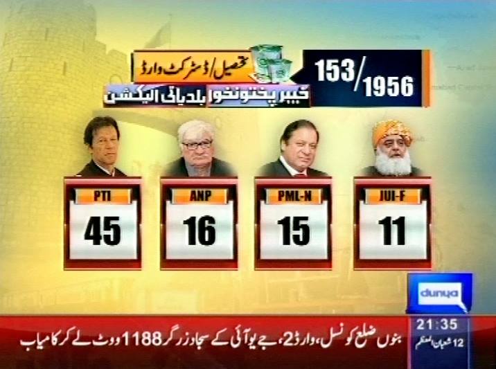 7:29 Buner: Kamran Khan win by obtaining 1500 votes in ward 11. Voter turn out was 35%.