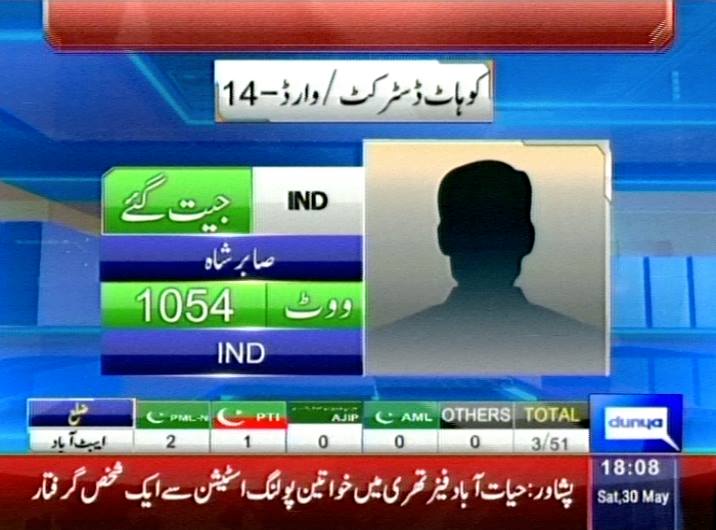 5:19 Kohat: UC Samari, Sabir Shah successful with 1024 votes in ward 14.