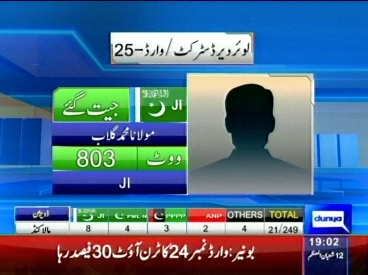 7:08 Lower Dir: JI s Moulana Muhammad Gulab wins election, obtaining 803 votes.