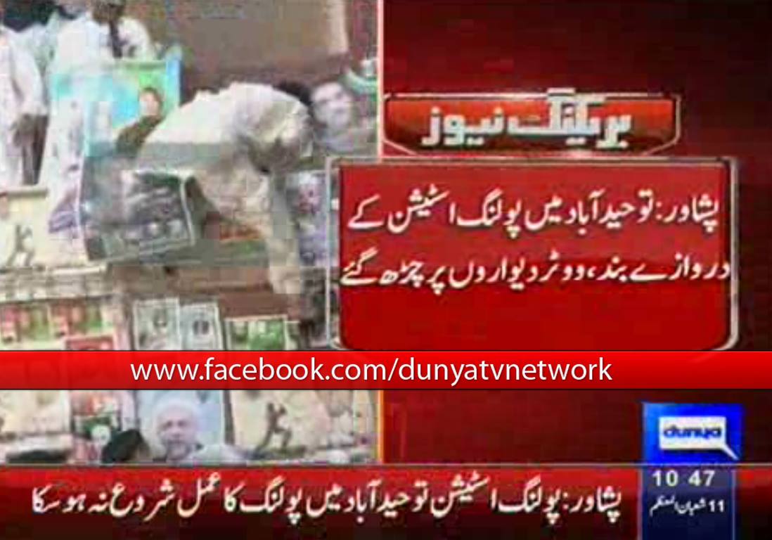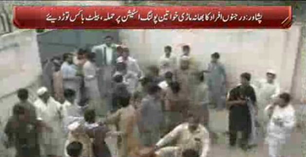 3:40 Polling process stopped after dozens of miscreants attack Bhana Mari women polling station in Peshawar. Angry men smash several ballots boxes.