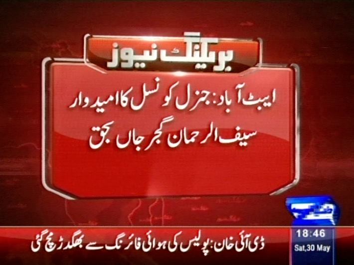 6:47 Abbotabad: Independent UC candidate Saifur Rehman killed due to firing.