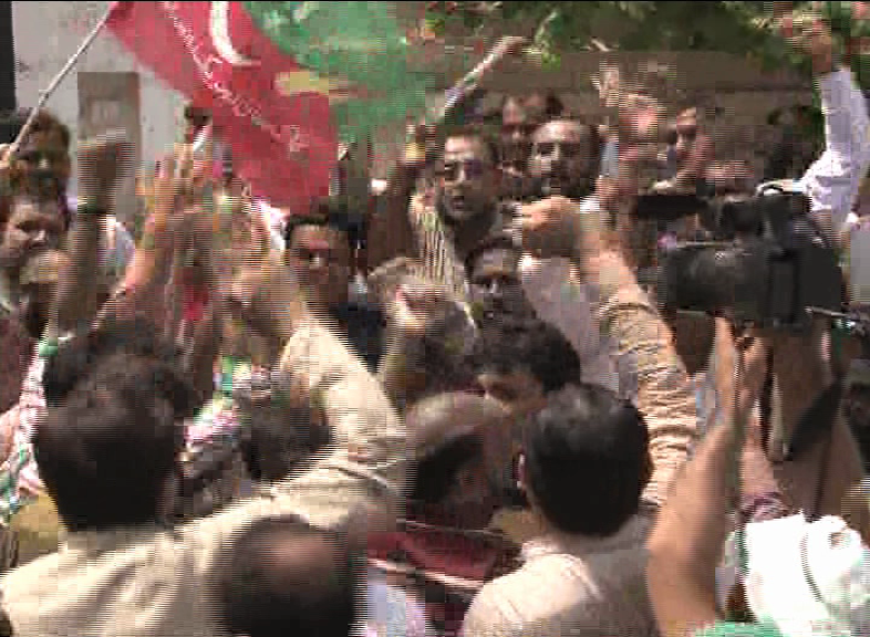 MULTAN (Dunya News) – Pakistan Muslim League-Nawaz (PML-N) and Pakistan Tehreek-e-Insaf (PTI) supporters on Wednesday faced-off outside the election tribunal’s office in Multan ahead of NA-154 verdict announcement, Dunya News reported.