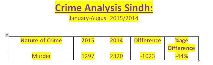 Research in “Tonight With Moeed Pirzada” showed with the help of tables that between January to September 2015, 3484 cases of murder were registered as compared to 4720 in the corresponding period of 2014; this difference of 1236 less murder, is a reduction of 26 percent. Similarly 4013 cases of attempted murder were registered in this period as compared to 5556 cases in the corresponding year of last year; thus the decrease of 28 percent.