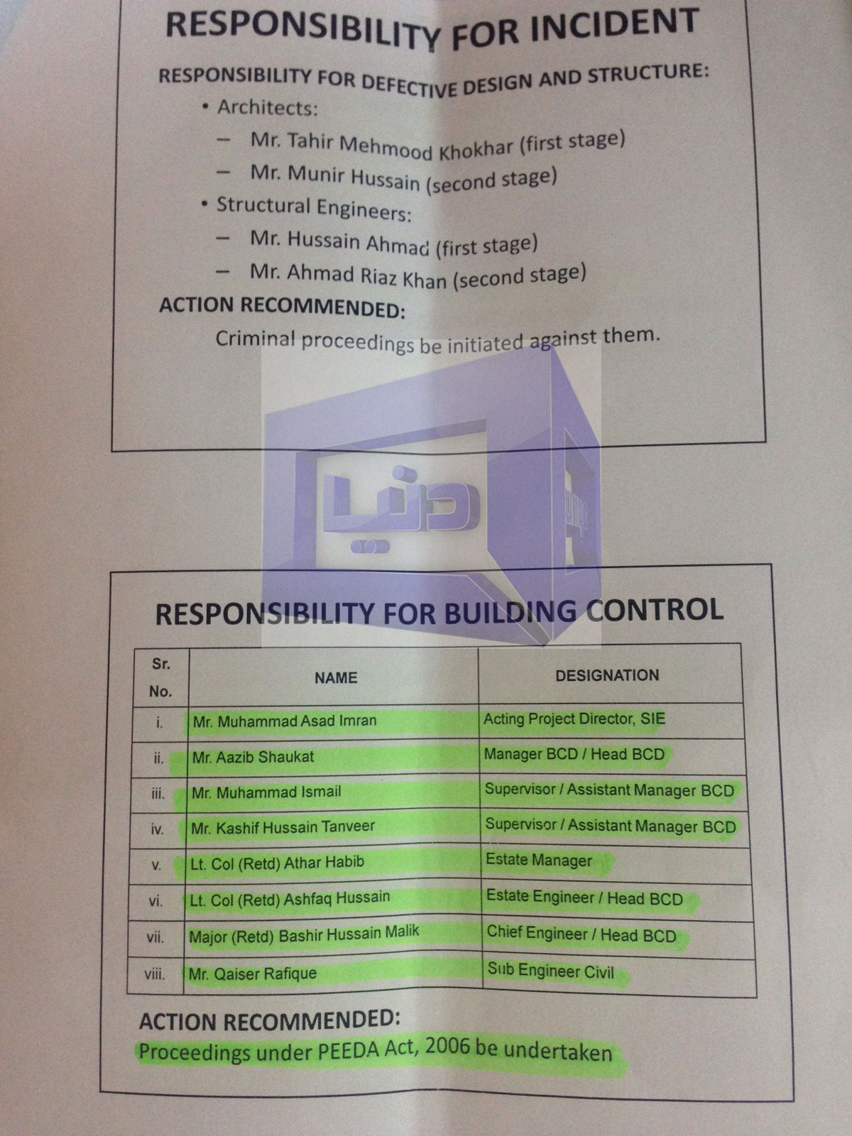 Summary Dunya News got copy of inquiry report suggesting action against responsible according to PEEDA Act