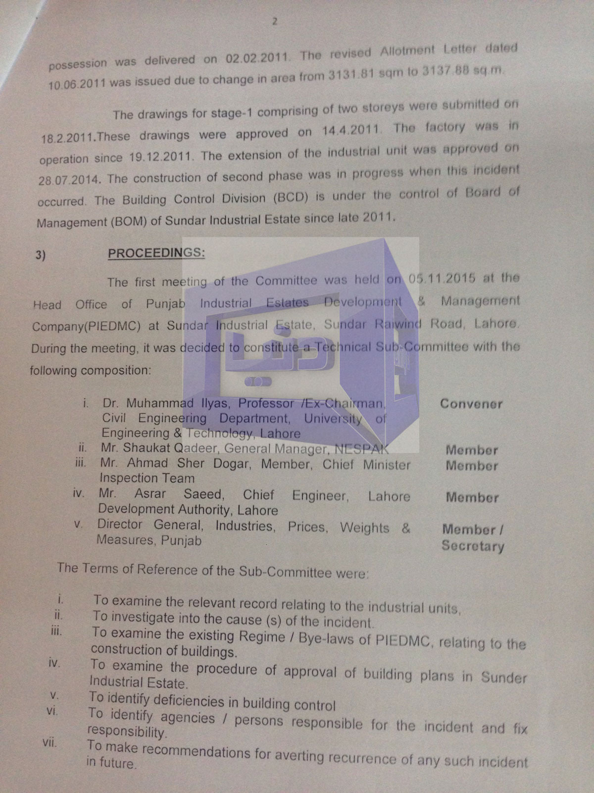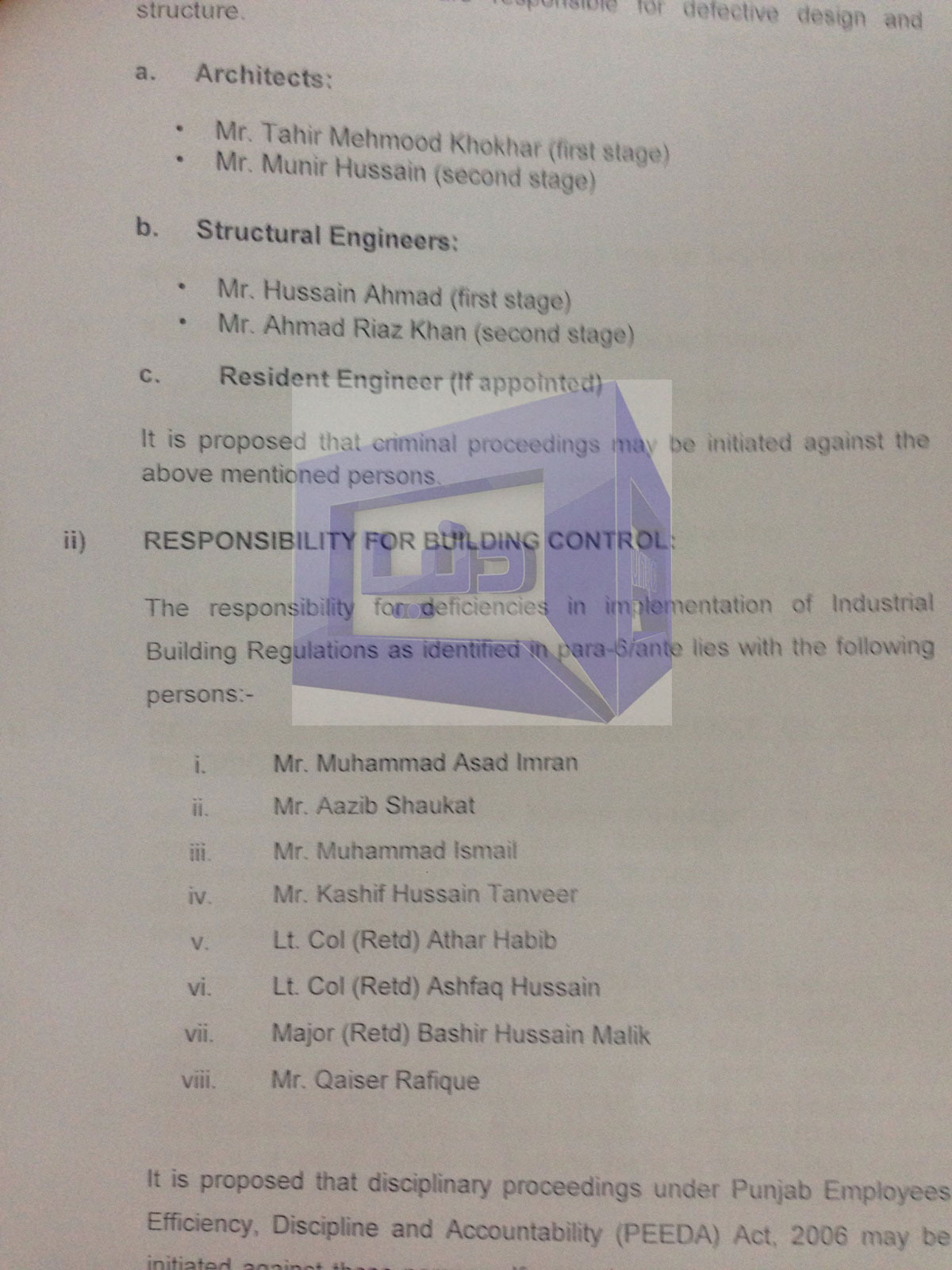 According to details, Chief Minister (CM) Punjab ordered Secretary Industries Nabeel Javed to prepare an inquiry report on the Sundar Industrial State incident. The report consisting of 15 pages, states that the responsibility of the accident lies on owner Muhammad Ashraf, 2 engineers and architects, while 8 bureaucrats are held responsible for supervision of building’s construction and failure in building control rules and other similar affairs. It is also suggested in the report to take action against the responsible bureaucrats according to the Punjab Employees Efficiency, Discipline and Accountability (PEEDA) Act. The accused bureaucrats include Muhammad Asad Imran, Aazib Shaukat, Muhammad Ismail, Kashif Tanveer, Col. (R) Ishfaq Hussain, Col. (R) Basheer Hussain and Qaiser Rafique. Action against negligence in monitoring and surveillance of building is also suggested in the report.