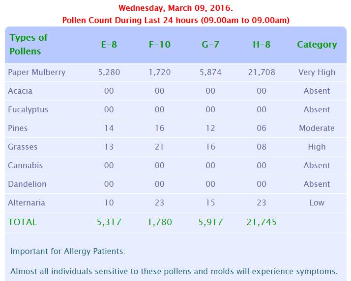 Among them, paper mulberry pollen has the largest concentration in Islamabad and its peak season matches with March. This may be treated as first alert for the patient’s sensitive the pollen allergy.
