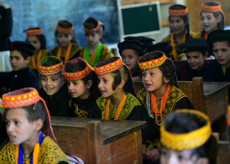 Kalash students attend a class at a school in the Brun village of Bumboret valley in Pakistan - AFP