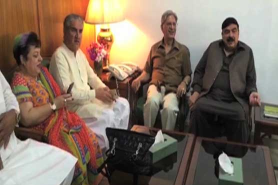 Pakistan Tehreek-e-Insaf’s (PTI) vice-chairman Shah Mehmood Qureshi, Awami Muslim League (AML) chief Sheikh Rasheed, Muttahida Qaumi Movement’s (MQM) Barrister Saif, PTI’s secretary general Jahangir Tareen, PTI’s spokesperson Shireen Mazari, Sahibzada Tariqullah, Ilyas Bilour and others took part in the meeting.