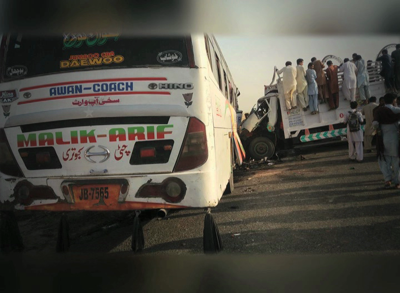 According to details, the accident took place when an ill-fated bus en route to Chakwal collided with a speeding truck coming from opposite side near Nasirabad.