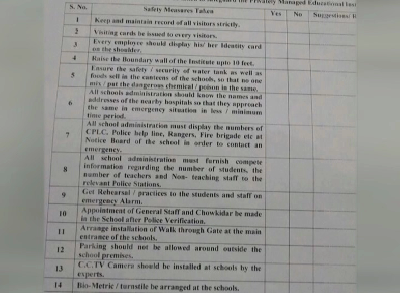 According to the instructions, administration of schools will have to issue passes for visitors while officials must have contact numbers of nearby hospitals and police stations.