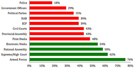 The survey concludes that armed forces are termed as the most trusted institution with 76% approval rating in 2016 compared to 75% in 2015 while police enjoy lowest public trust as only 18% nationwide respondents have rated it positively.