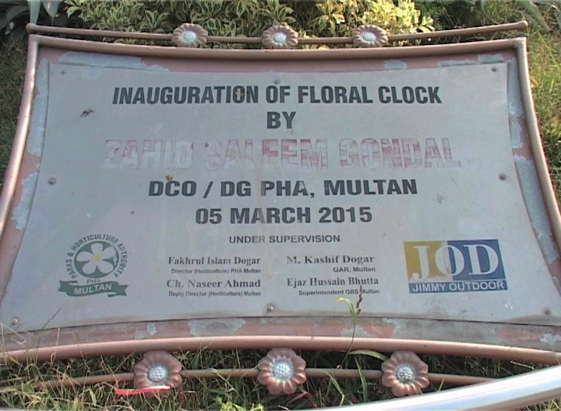 The floral clock was installed during the renovation of Qila Kohna Qasim Bagh for the beautification purpose of the city.