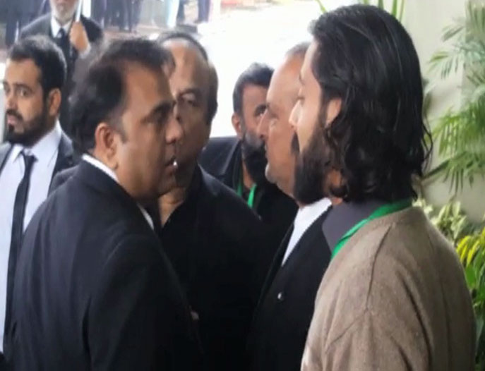 Meanwhile, PTI lawyer Babar Awan tried to maintain calm between both the men.