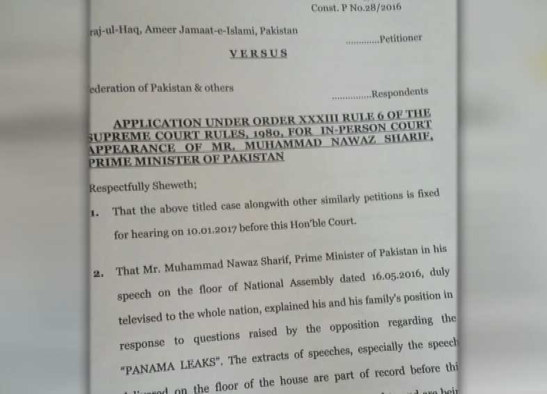 ISLAMABAD (Dunya News) – Jamaat-e-Islami (JI) has filed a petition in the Supreme Court today (Tuesday) asking it to summon Prime Minister Nawaz Sharif to clarify his stance on the Panama Papers issue.