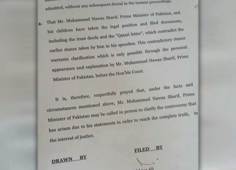 Referring to Nawaz Sharif’s speech on the floor of National Assembly on May 16, 2016, the application submitted by Taufeeq Asif states that the Prime Minister and his children have taken the legal position and filed documents, including the trust deeds and the “Qatari letter”, which contradict the earlier stance taken by him in his speeches.