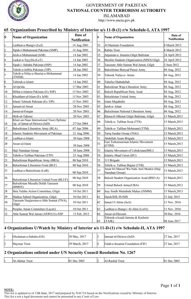 The Nation reported that the Interior Ministry banned TAJK on June 8 and enlisted it as a proscribed organisation. Abdul Aziz Alvi is the chairman of TAJK, and also a close member of JuD. Indian media reacted to the matter after Trump-Modi meeting in Washington.