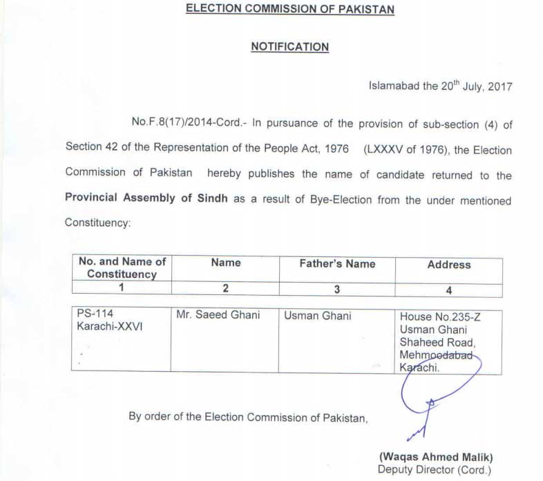 Summary PPP's Saeed Ghani had secured more than 23,000 votes to win PS-114 by-election.