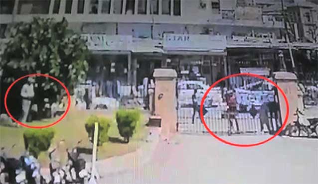 KARACHI (Dunya News) – in the CCTV footage acquired by Dunya News, it could be clearly seen that five unidentified persons arrived outside MC building and pasted anti-mayor banners on the walls of the building.