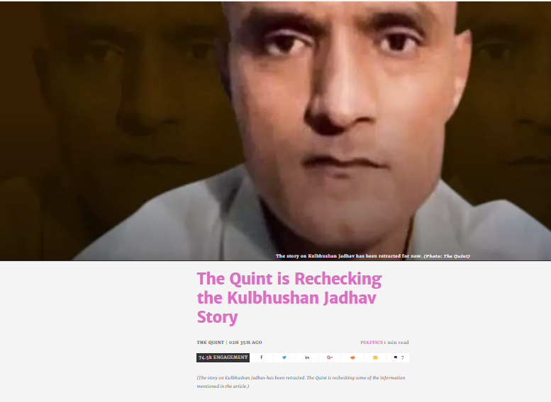 According to details, The Quint declared Pakistan’s claim that Kulbhushan is an India spy as true. It further wrote that Jadhav was hired by higher officials of RAW for terrorist activities in Pakistan.