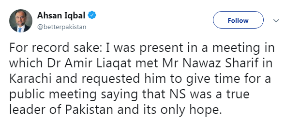 Summary Dr Aamir Liaquat had declared Nawaz Sharif true leader of Pakistan, asserts Ahsan Iqbal.