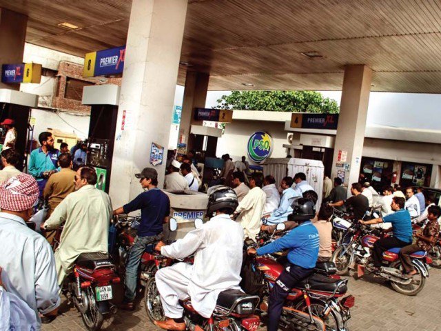 People lining up in a petrol pump in Lahore. Photo: File