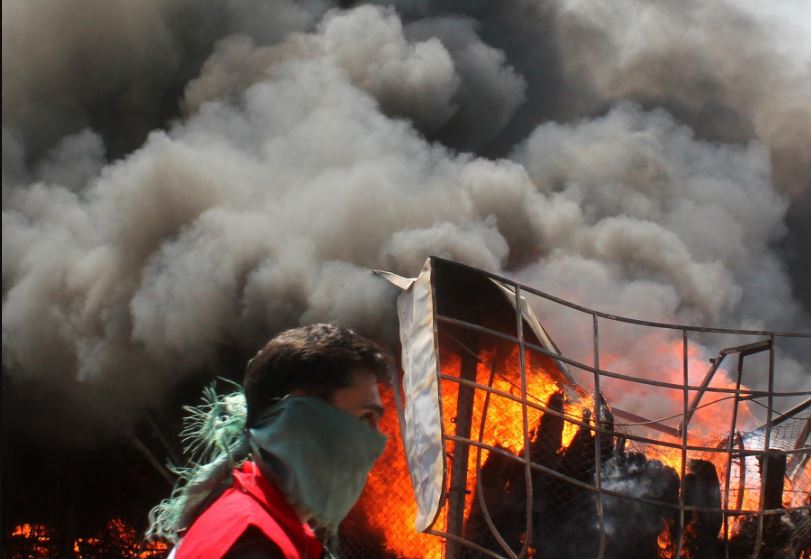 A horrific view of the fire and a person standing side by a fiery stall. Photo: S M Sohail