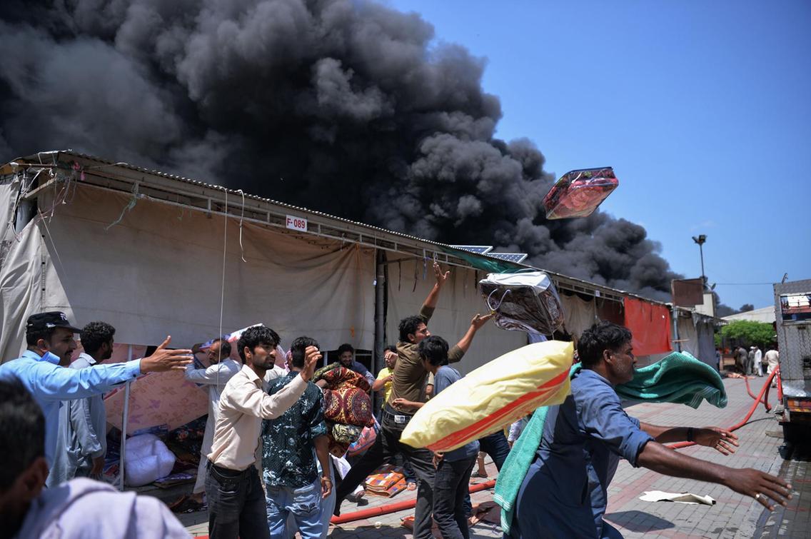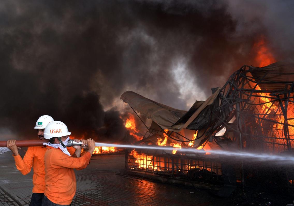 A number of fire-fighter teams including vehicles from Rescue 1122 and Quick Response Force were dispatched to Sasta Bazaar in Islamabad’s G-9 sector. Photos: The National