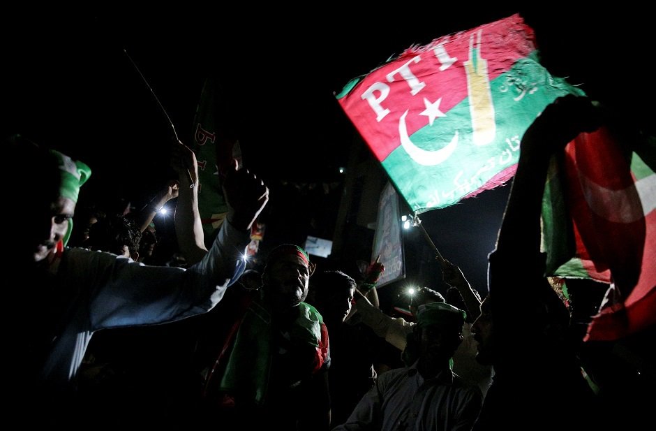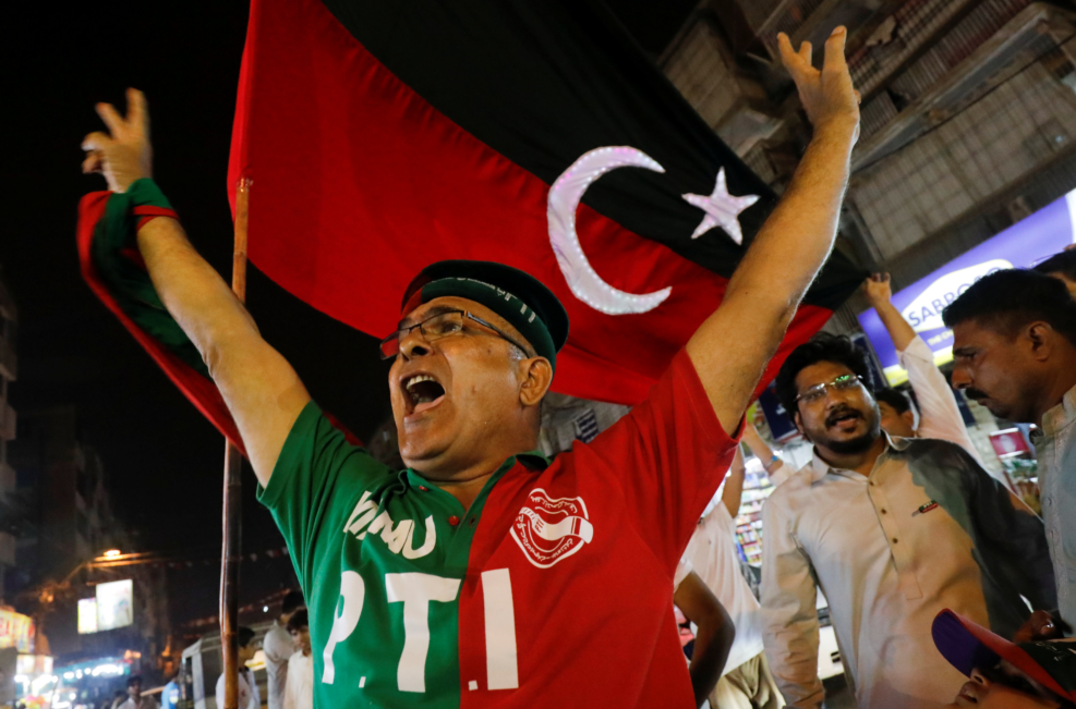 Supporters celebrate win outside Bani Gala. Photo: REUTERS