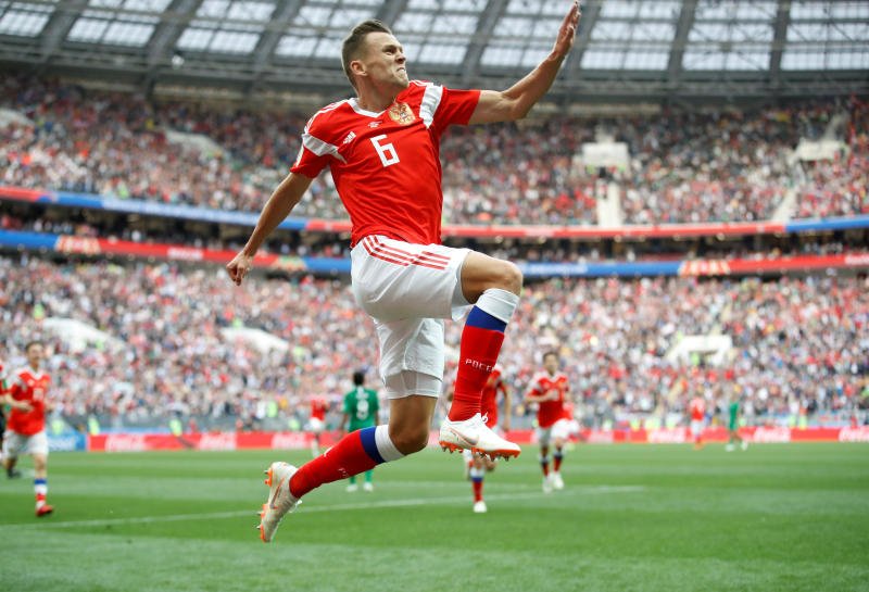 Then, to the delight of the home fans, Iury Gazinsky headed Russia in front in the 12th minute after a cross from Aleksandr Golovin. Substitute Denis Cheryshev rifled home a second shortly before half-time.