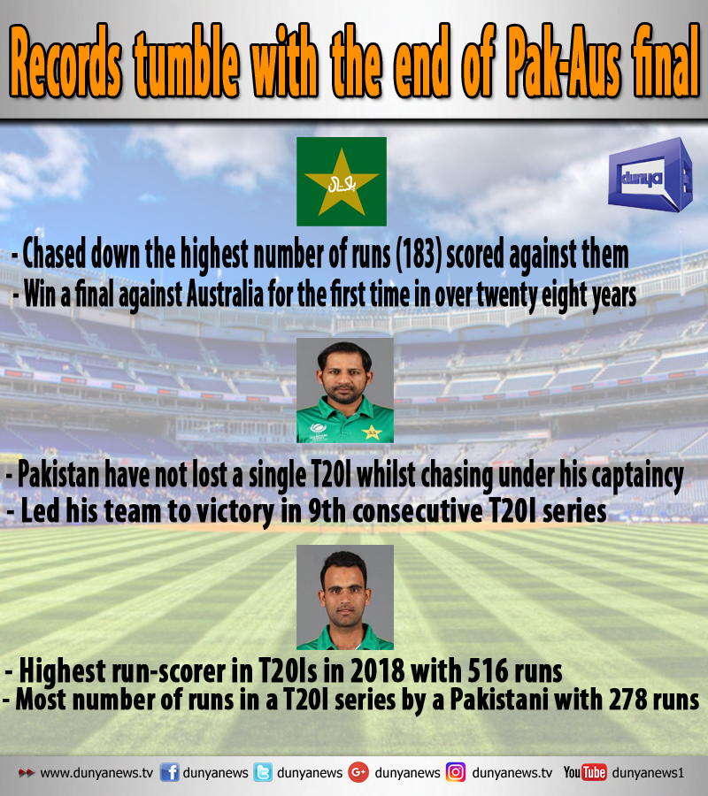(WebDesk) - With the FIFA World Cup fast approaching the more interesting Semifinal round and the Wimbledon starting in England, the three way series between Australia, Pakistan and Zimbabwe wasn’t given much of a priority by the sports fans. The final of the series that concluded yesterday, however, eventually turned quite a few heads as the thrilling encounter led to a number of records being broken on Sunday.
