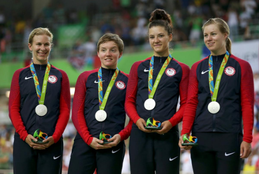 FILE PHOTO: 2016 Rio Olympics - Cycling Track - Victory Ceremony - Women s Team Pursuit Victory Ceremony - Rio Olympic Velodrome - Rio de Janeiro, Brazil - 13/08/2016.Sarah Hammer (USA) of USA, Kelly Catlin (USA) of USA, Chloe Dygert (USA) of USA and Jennifer Valente (USA) of USA on podium with the silver medals. REUTERS/Matthew Childs