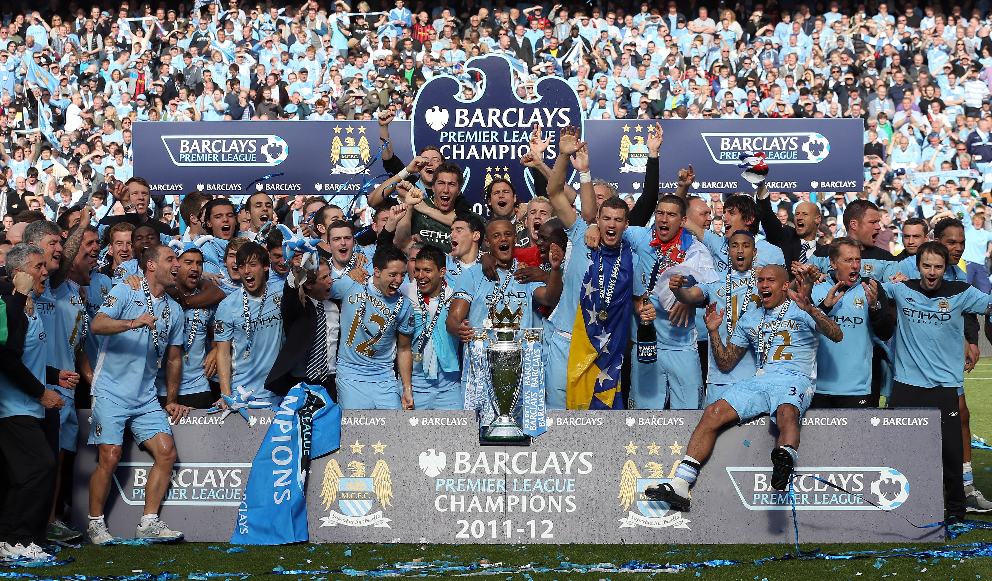 Soccer: 2012 Manchester City: Manchester City appeared to be suffering a dramatic collapse when they trailed Queens Park Rangers 2-1 on the final day of the season. But two stoppage-time goals just before the final whistle completed a 3–2 win over QPR and secured City the English top-flight title for the first time in 44 years.