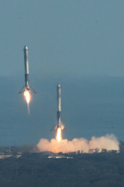 The SpaceX Falcon Heavy booster rockets land at Kennedy Space Center, Florida, on February 6, 2018. Photo: AFP